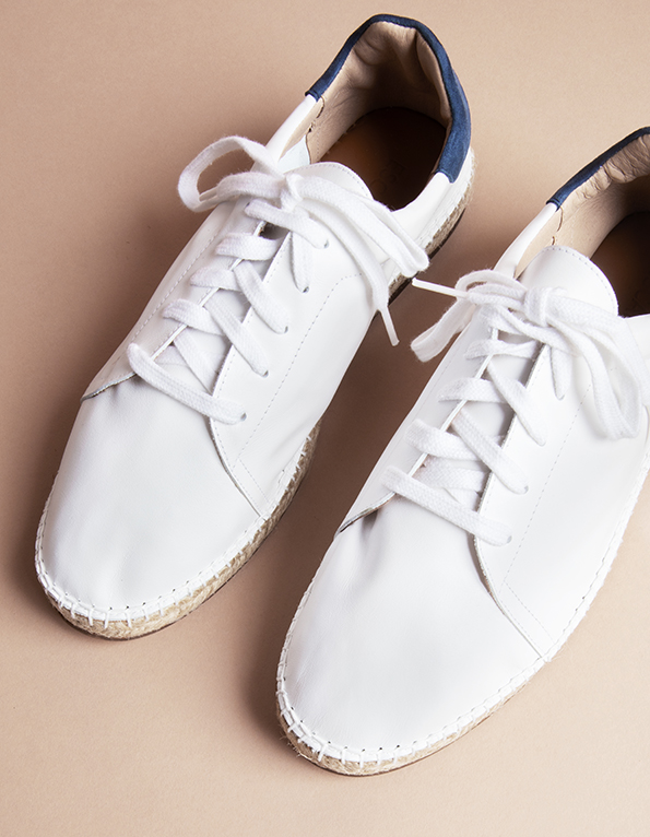 | Description | Baskets espadrilles fabriquées en Espagne près de Alicante. Elles sont en cuir blanc avec l'arrière en daim marine. |