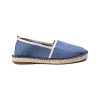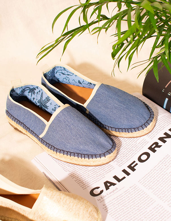Espadrille homme en jean avec un intérieur personnalisé par la super équipe de la Californie Française, ( marque de vêtements au style cool dessinée en Auvergne!) une finition en daim sur l’arrière et un ruban gros grain beige.