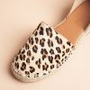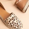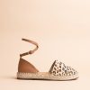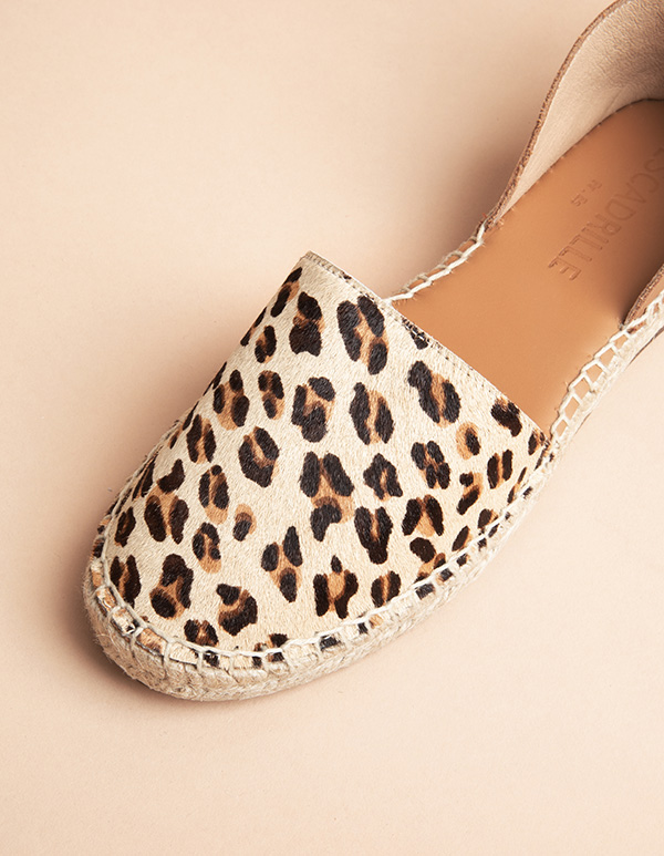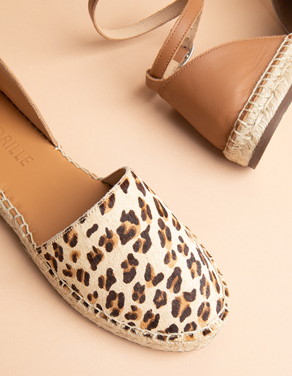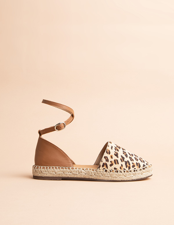 | Description | Espadrille plate en cuir naturel et cuir léopard avec une double boucle autour de la cheville. |