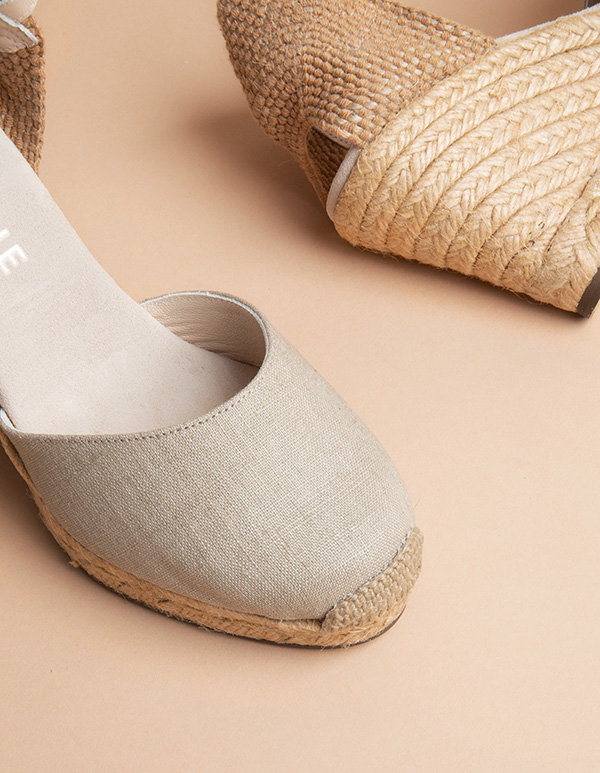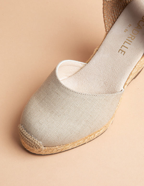 Espadrilles à talon compensé moyen avec bride. En toile de lin doublée de cuir. Très facile à associer !