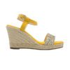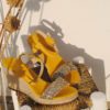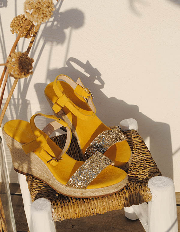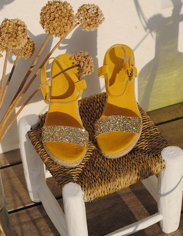 Incontournable cet été, l’espadrille femme compensée jaune miel Lovrecina joue sur la tendance des espadrilles à paillettes dorées pour sublimer toutes vos tenues.
