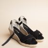 Nos espadrilles Minorque à talon moyen sont idéales pour les belles journées ensoleillées. Ces espadrilles à talon compensé ouvertes sont déclinées avec un ruban gros grain noir à nouer autour de la cheville pour un style raffiné.
