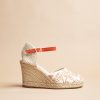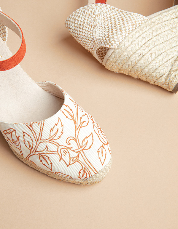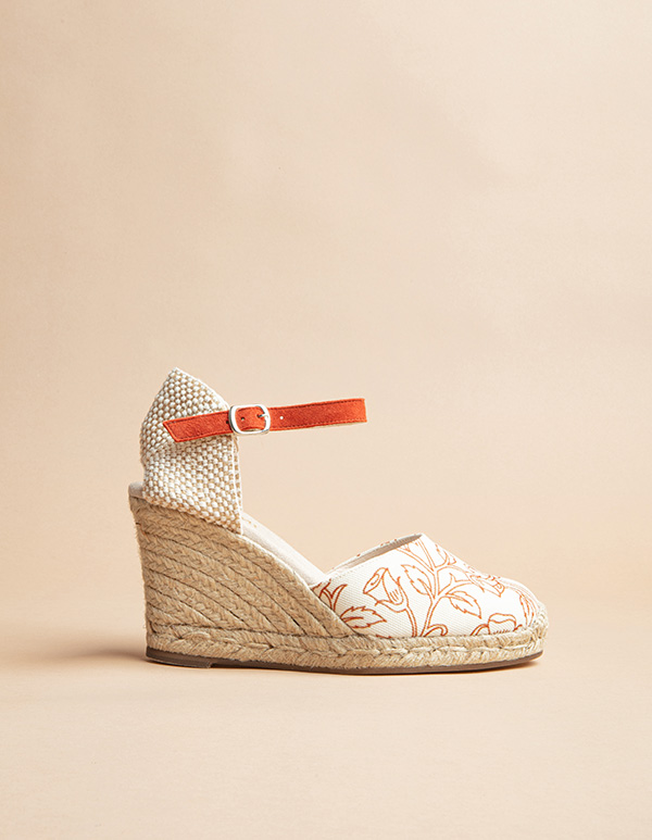 Jolie paire d’espadrilles à talon avec bride en cuir daim couleur terracotta imaginée en collaboration avec la marque Jamini Design. Inspirées d’un motif indien du Rajasthan, ces paires sublimeront vos tenues.