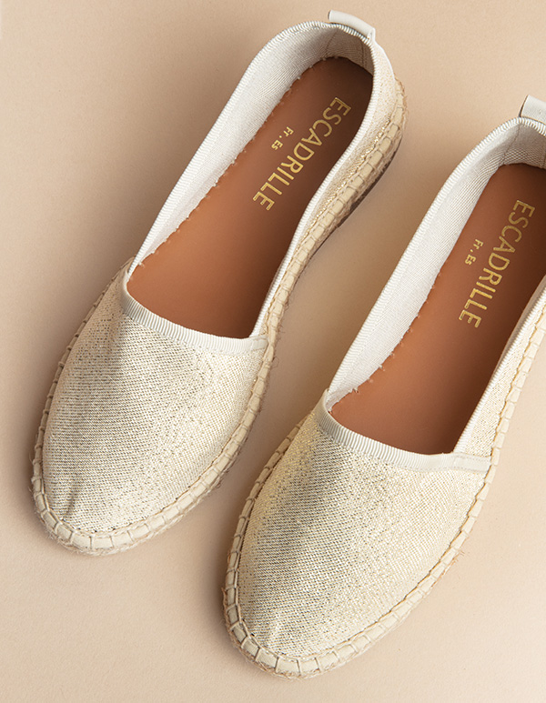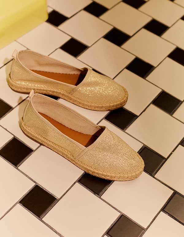 Accessoire de mode, l’espadrille dorée Venezia se porte à la façon d’un bijou, qui illumine, donne de l’éclat et met en valeur toutes les tenues.