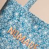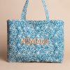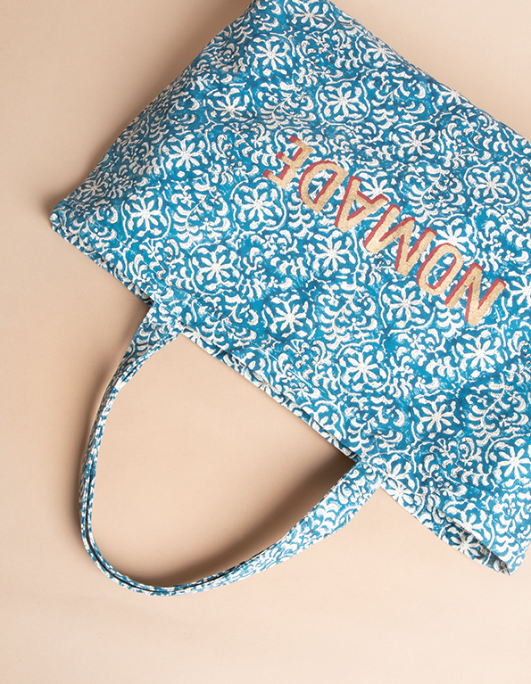 | Description | Blue cotton beach bag with ecru pattern and a touch of honey. Handmade printing, block printing technique. |