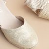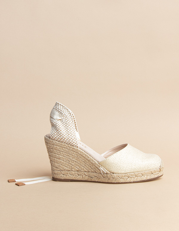 These golden espadrilles tone up any outfit with a French sophisticated touch. The ankle ribbon and the high heel are also very flattering.