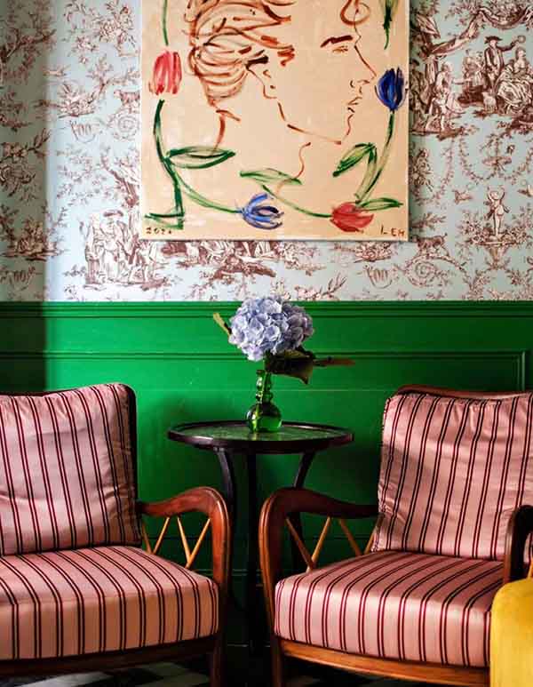 Ce que nous aimons particulièrement dans cet hôtel, c’est la décoration, que l’on peut qualifier de décalé. Le chic à l’anglaise, dans un esprit français. C’est l’artiste britannique Luke Edward Hall qui en est à l’origine. Des papiers peints, des tapis géométriques, des meubles anciens inspirés de toutes les époques, des salles de bains aux couleurs pastel inspirées des années 1920, le tout sous le même toit, pour un voyage excentrique, aux côtés rétro-seventies.